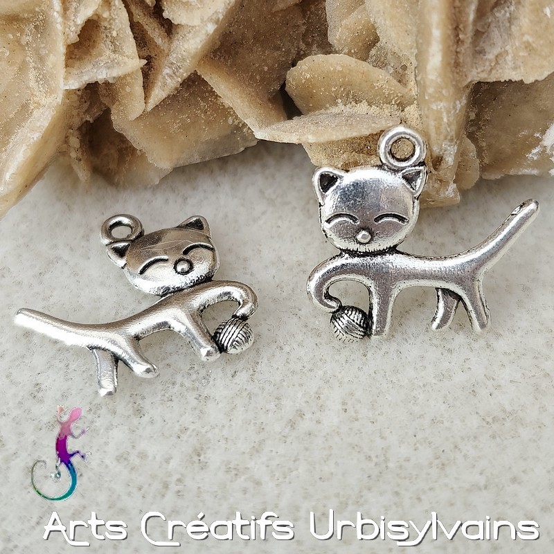 Breloque charms chat en métal argenté antique.